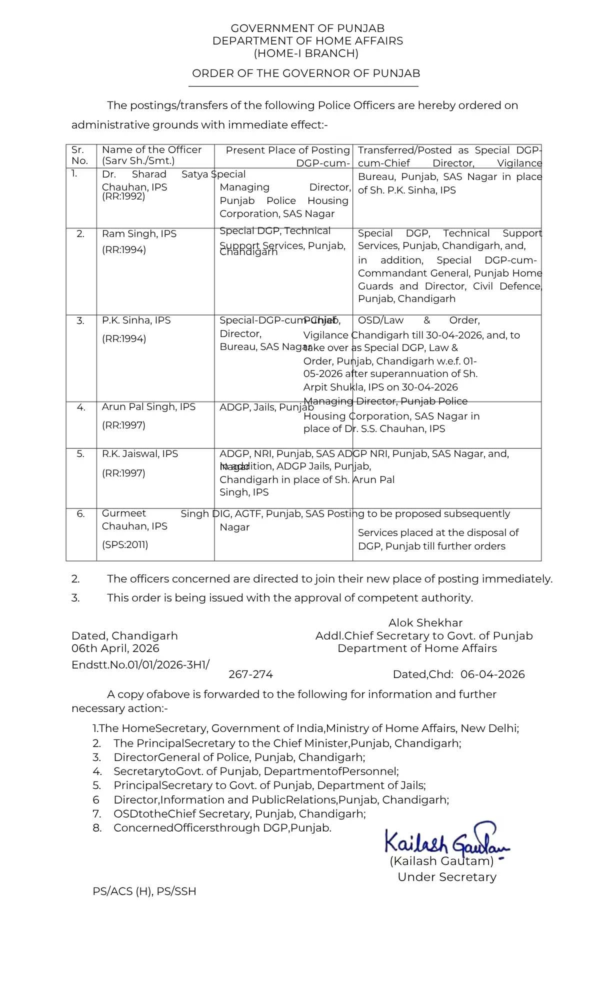 पंजाब डैस्क : पंजाब में तबादलों के दौर लगातार जारी है। इसी कड़ी के तहत अब 5 आई.पी.एस. अधिकारियों की ट्रांसफर कर दी गई है। पंजाब सरकार ने बड़ा बदलाव करते हुए उक्त अधिकारियों की नई नियुक्तियां की है, जिसके तहत शरद सत्य चौहान को पंजाब का नया विजिलेंस डायरेक्टर नियुक्त किया गया है। इसके साथ ही वरिष्ठ आईपीएस अधिकारी पी.के. सिन्हा को स्पेशल डीजीपी (लॉ एंड ऑर्डर) की जिम्मेदारी सौंपी गई है। वह इस पद पर अर्पित शुक्ला की जगह लेंगे।