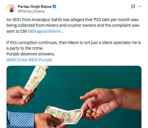 राज्य में करप्शन को लेकर बड़ा खुलासा हुआ है, जिस पर कांग्रेस के वरिष्ठ नेता प्रताप बाजवा ने एक बार फिर पंजाब सरकार को आड़े हाथों लिया है।