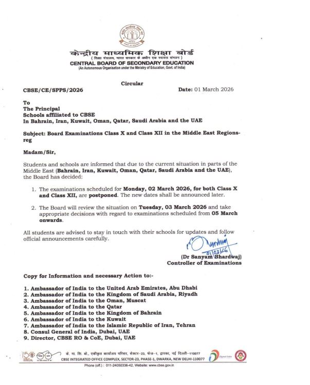 जानकारी अनुसार मिडिल ईस्ट क्षेत्र में बढ़ते सैन्य तनाव और अस्थिर हालात को देखते हुए सेंट्रल बोर्ड ऑफ सेकेंडरी एजुकेशन (सीबीएसई) ने बहरीन, ईरान, कुवैत, ओमान, कतर, सऊदी अरब और यूएई में सोमवार को होने वाली दोनों कक्षाओं की परीक्षाएं फिलहाल टाल दी हैं। बोर्ड ने साफ किया है कि मौजूदा परिस्थितियों में विद्यार्थियों और परीक्षा स्टाफ की सुरक्षा सबसे बड़ी प्राथमिकता है।