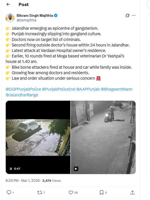 पंजाब के जालंधर शहर में गैंगस्टर हिंसा तेजी से बढ़ती जा रही है, जिसे लेकर अकाली नेता बिक्रम मजीठिया ने ट्वीट कर गंभीर चिंता जताई है। मजीठिया ने कहा कि ''जालंधर गैंगस्टर की हिंसा का केंद्र बन रहा है। पंजाब धीरे-धीरे गैंगस्टर संस्कृति की ओर बढ़ रहा है।