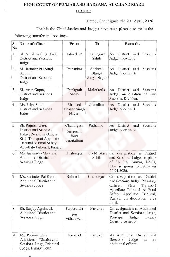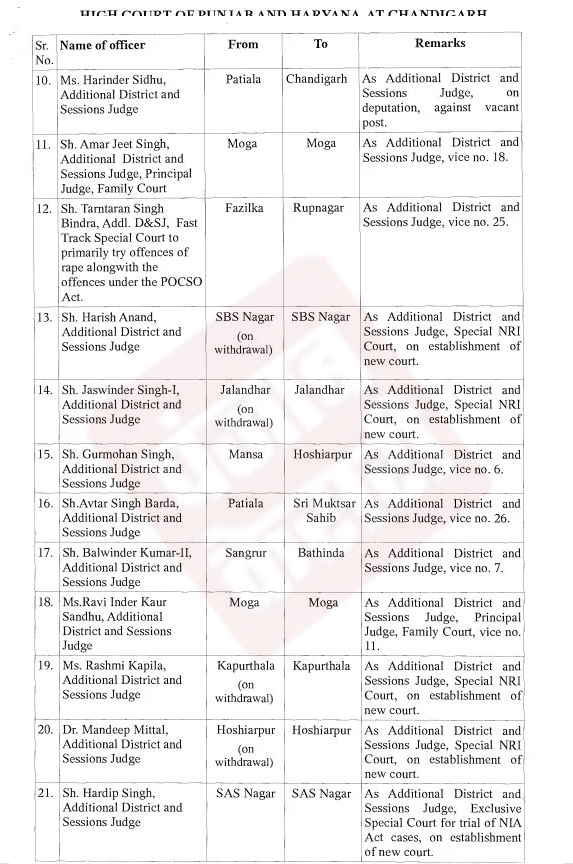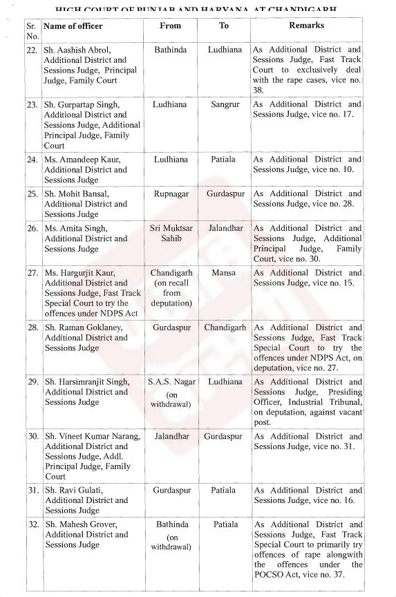 पंजाब एवं हरियाणा हाईकोर्ट के आदेशों के अनुसार आज बड़े स्तर पर न्यायिक अधिकारियों के तबादले किए गए हैं।