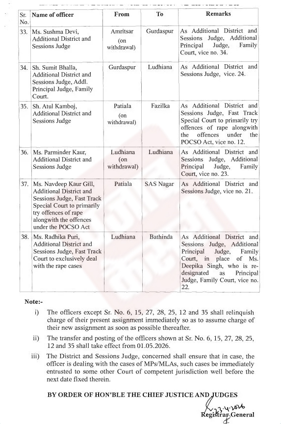 इस तबादला सूची में कुल 38 न्यायिक अधिकारियों का स्थानांतरण किया गया है। इसमें अतिरिक्त जिला एवं सत्र न्यायाधीश जसविंदर सिंह को जालंधर की नई स्थापित एनआरआई अदालत में नियुक्त किया गया है।