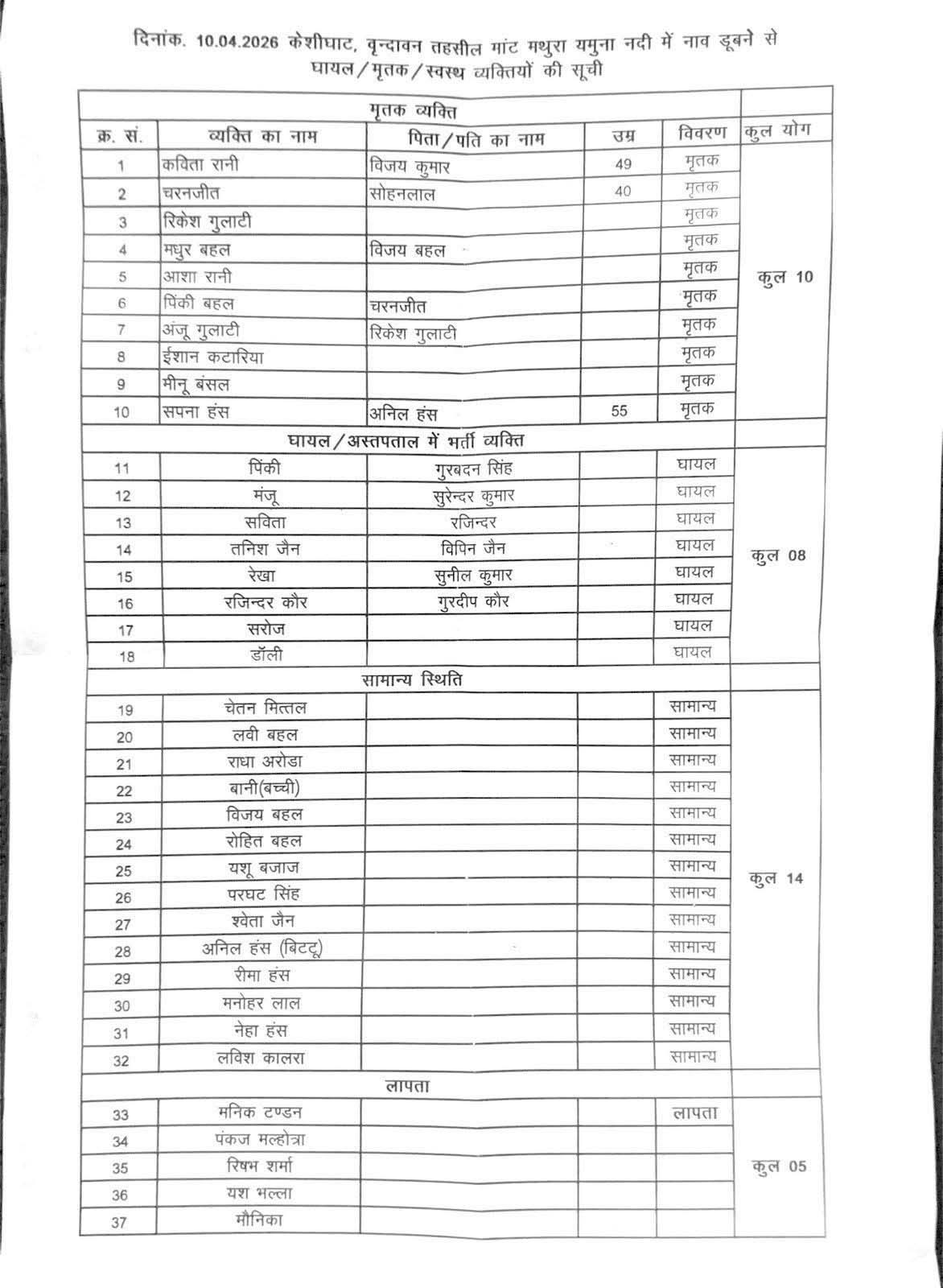 लुधियाना : वृंदावन में यमुना नदी में एक स्टीमर पलटने से बड़ा हादसा हो गया। हादसा मथुरा जिले के वृंदावन क्षेत्र में हुआ, जहां श्रद्धालुओं से भरा स्टीमर अचानक संतुलन बिगड़ने के कारण नदी में पलट गया। इस हादसे में अब तक 10 श्रद्धालुओं की मौत की पुष्टि हो चुकी है। स्टीमर में करीब 30 लोग सवार थे, जिनमें से लगभग एक दर्जन लोग अभी भी लापता बताए जा रहे हैं। हादसे की सूचना मिलते ही प्रशासन और राहत-बचाव टीमें मौके पर पहुंच गईं और यमुना नदी में सर्च ऑपरेशन जारी है। मरने वालों सूची जारी हो गई है।