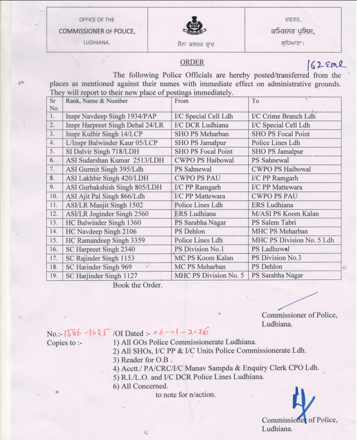 लुधियाना : लुधियाना शहर में पुलिस प्रशासन को और अधिक चुस्त-दुरुस्त व प्रभावी बनाने के उद्देश्य से बड़ा प्रशासनिक फेरबदल किया गया है। लुधियाना के पुलिस कमिश्नर की ओर से जारी आदेशों के तहत जिले के विभिन्न थानों में तैनात कई थाना प्रभारियों (एसएचओ) समेत कुल 19 पुलिस मुलाज़िमों के तबादले किए गए हैं। यह तबादले एक स्थान से दूसरे स्थान पर किए गए हैं, जिन्हें तुरंत प्रभाव से लागू करने के निर्देश भी जारी किए गए हैं।