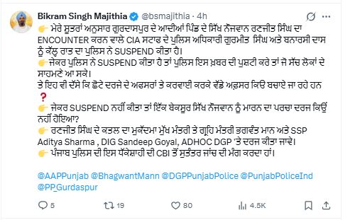 गुरदासपुर में युवक रणजीत सिंह के एनकाऊंटर मामले में पुलिस अधिकारियों के सस्पैंशन की खबर सामने आने के बाद बिक्रम मजीठिया ने तीखा निशाना साधा है।