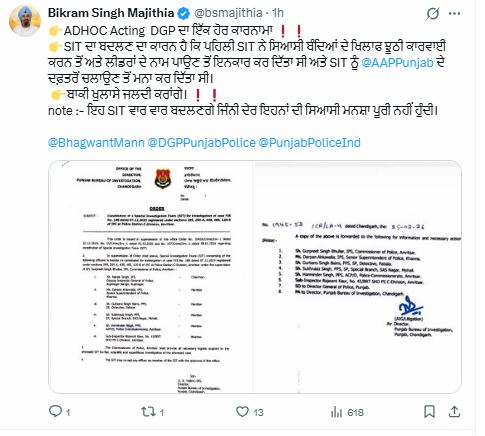 पंजाब डैस्क : अमृतसर में पावन स्वरूप लापता मामले में दर्ज एफआईआर में जांच तेज कर दी गई है तथा पंजाब सरकार ने इस मामले एक बार फिर एस.आई.टी. बदल दी गई है तथा अब नई एस.आई.टी. का गठन किया गया है। SIT के बार-बार पुनर्गठन को लेकर अब सियासी और प्रशासनिक हलकों में चर्चा तेज हो गई है। वहीं अकाली नेता बिक्रम मजीठिया ने पंजाब सरकार को निशाने पर लिया है। मजीठिया ने टवीट जारी करते हुए कहा है कि ADHOC कार्यवाहक DGP का एक और कारनामा बताया है। उन्होंने कहा है कि SIT बदलने की असली वजह यह है कि पहली SIT ने नेताओं के खिलाफ झूठी कार्रवाई करने और राजनीतिक दबाव में नाम जोड़ने से इन्कार कर दिया था। साथ ही उसने किसी राजनीतिक कार्यालय से SIT चलाने से भी मना कर दिया। बाकी सच्चाई जल्द उजागर की जाएगी। जब तक राजनीतिक मंशा पूरी नहीं होगी, तब तक SIT बार-बार बदली जाती रहेगी।