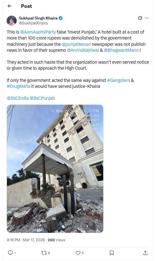 खैरा ने आरोप लगाया कि प्रशासन ने इतनी जल्दी कार्रवाई की कि होटल संचालकों को कोई नोटिस नहीं दिया गया और न ही उन्हें उच्च न्यायालय जाने का मौका मिला। उन्होंने कहा कि अगर सरकार इसी तेजी और कठोरता से गैंगस्टर और ड्रग माफिया के खिलाफ कार्रवाई करती, तो यह न्याय की सही दिशा में एक कदम होता।
