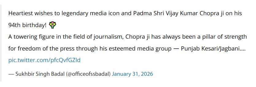 सुखबीर सिंह बादल ने विजय कुमार चोपड़ा जी को पत्रकारिता के क्षेत्र में एक "महान आइकन" बताया। उन्होंने कहा कि चोपड़ा जी अपने मीडिया समूह — पंजाब केसरी/जगबाणी के माध्यम से हमेशा प्रेस की स्वतंत्रता के लिए मजबूत आधार बने रहे हैं। पत्रकारिता के क्षेत्र में उनका योगदान देश और खासकर पंजाब के लिए बेमिसाल है। उन्होंने गुरु साहिब के समक्ष प्रार्थना की कि विजय कुमार चोपड़ा जी इसी तरह पत्रकारिता के माध्यम से समाज की सेवा करते रहें और उन्हें अच्छी सेहत और लंबी उम्र की आशीर्वाद प्राप्त हो।