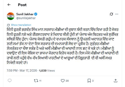 जालंधर : जालंधर में पंजाब केसरी के होटल पार्क प्लाजा पर बुल्डोजर चलाए जाने को लेकर भाजपा के प्रदेशाध्यक्ष सुनील जाखड़ ने तीखा हमला बोला है। जाखड़ ने टवीट जारी कर पंजाब सरकार पर आरोप लगाया है कि भगवंत सिंह मान सरकार मीडिया की आवाज़ को दबाने में तेजी दिखा रही है। भाजपा का कहना है कि अगर सरकार इसी फुर्ती से नशे और गैंगस्टरवाद के खिलाफ कार्रवाई करती, तो पंजाब आज बेहतर और सुरक्षित स्थिति में होता।