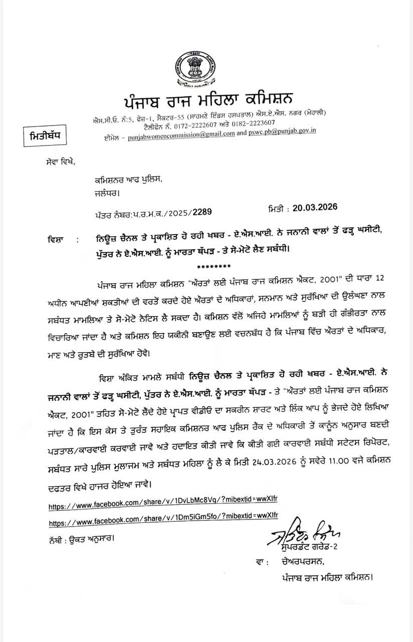 महिला आयोग ने महिला के साथ कथित तौर पर मारपीट और दुर्व्यवहार की वीडियो की खबरें सोशल मीडिया पर देखने के बाद आयोग ने संज्ञान लिया है। पंजाब राज्य महिला आयोग ने “महिलाओं के लिए पंजाब राज्य महिला आयोग एक्ट, 2001” के तहत अपने अधिकारों का प्रयोग करते हुए पुलिस प्रशासन को निर्देश दिए हैं कि मामले की निष्पक्ष जांच सुनिश्चित की जाए। आयोग ने संबंधित पुलिस अधिकारियों को निर्देश दिया है कि वे मामले से जुड़े सभी दस्तावेजों और तथ्यों सहित 24 मार्च 2026 को सुबह 11:00 बजे उपस्थित हों।